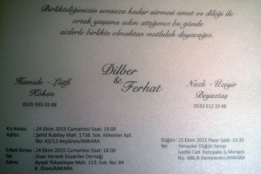 Köyümüz mensuplarından Üzeyir BEYAZTAŞ' ın oğlu Ferhat BEYAZTAŞ 25.10.2015 tarihinde Dilber KÖKEN ile dünya evine giriyor.![]() Çifte bir ömür boyu mutluluklar dileriz. SİSDER YÖNETİM KURULU |