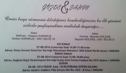 Gözde KARAKUŞ ve Şahin KOLDAŞ'ın düğün törenleri. Saygı ile andığımız Rahmetli Hüseyin KARAKUŞ ve Selfinaz KARAKUŞ’un kızı, SİS-DER Üyemiz Serkan KARAKUŞ'un kız kardeşi Gözde KARAKUŞ Şahin KOLDAŞ ile 28.08.2016 tarihinde saat 20:00’da Ankara’da yapılacak düğün törenleriyle dünya evine girecektir.![]() Çifte bir ömür boyu mutluluklar dileriz. SİS-DER YÖNETİM KURULU |